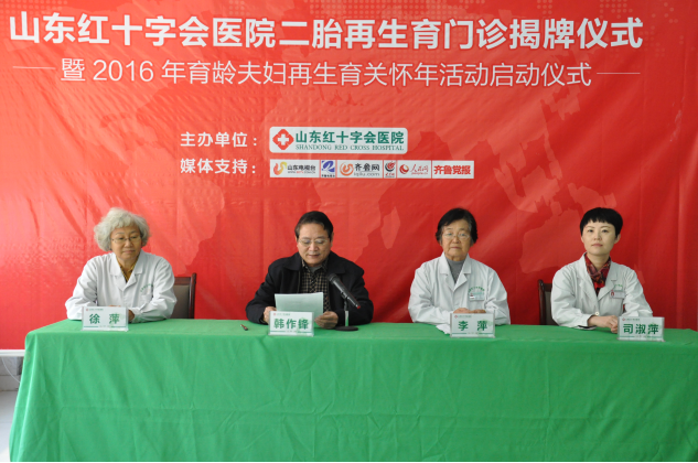 2015年12月12日,山东红会福娃娃医院二胎再生育门诊揭牌仪式暨2016年育龄夫妇再生育关怀年活动启动仪式,在山东红会福娃娃医院如期举行。山东红十字医院业务院长韩作锋、生殖健康与不孕症专业李萍主任为代表的专家团队共同出席揭牌仪式。随着二胎再生育门诊正式成立,山东红会福娃娃医院2016年育龄夫妇再生育关怀年活动全面开启。